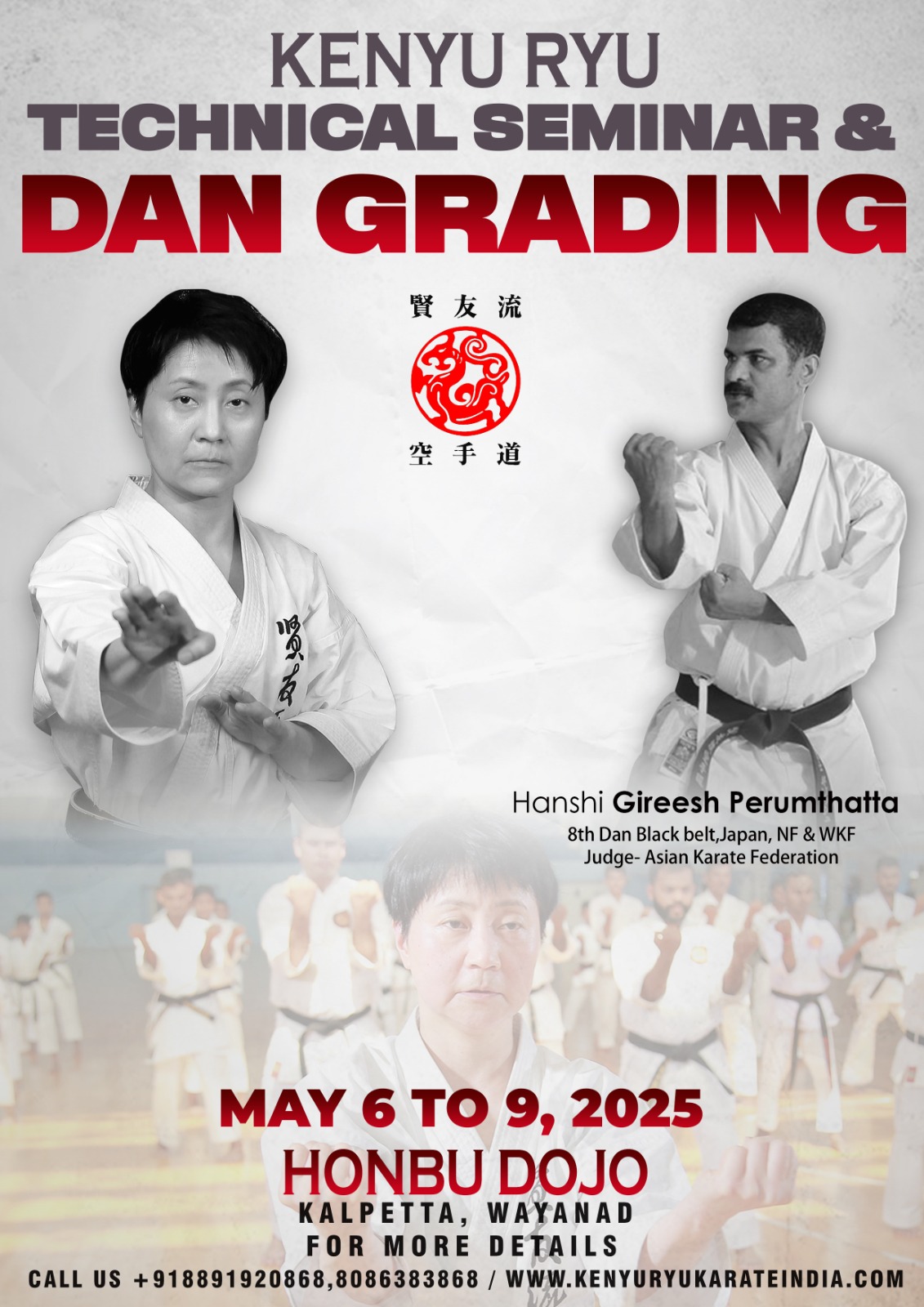 KENYU RYU TECHNICAL SEMINAR & DAN GRADING Hanshi Gireesh Perumthatta 8th Dan Black belt,Japan, NF & WKF Judge- Asian Karate Federation MAY 6 TO 9, 2025 HONBU DOJO KALPETTA, WAYANAD FOR MORE DETAILS CALL US +918891920868,8086383868 / WWW.KENYURYUKARATEINDIA.COM
